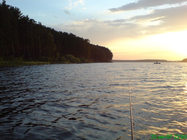 [75 Кб.] 2007, 22 июня, Верхне-Сысертский пруд. Лодка Сергея и моя "замерли" в 30 метрах от берега, окуни клевали на мелкие "вращалки", но мой лепесток "Blue Fox" (Синяя Лиса) №4 тоже имел определенный успех.