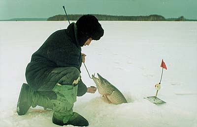 К часу дня начинаем собираться домой. Иду снимать жерлицы, и вдруг - подъем флажка! С этой щукой пришлось повозиться. Зацепилась она где-то за подводную коряжину. Потом снялась с нее и уперлась в лунке. Беру щуку багориком. На вид - больше четырех килограммов. Димка в восторге прыгает вокруг щуки, чего-то приговаривает, но, увидев кровь, смолкает, осторожно гладя щучий бок. Трудно объяснить ему, почему все так устроено, почему азартно ловить рыбу, бить дичь... Многие ли взрослые могут объяснить сами себе такие вещи?