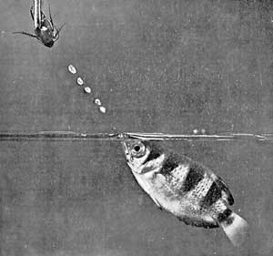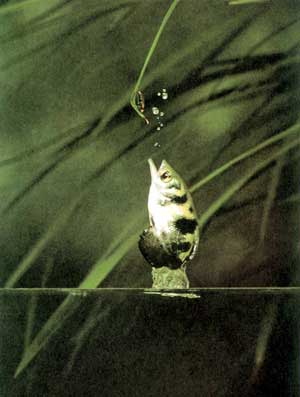 Эти небольшие, до 20 см длиной, рыбки при своей вполне заурядной внешности обладают одной совершенно исключительной способностью - они добывают себе пропитание, стреляя в добычу... струйкой воды. Принадлежат эти рыбы к отряду окунеобразных (о чем говорит, в частности, их спинной плавник, состоящий, как и у наших окуня, ерша и судака, из двух - колючей и мягкой - частей) и относятся к семейству Брызгунов (Toxotidae). Английское название этих рыб - archerfish - переводится как "рыба-лучник", и тоже достаточно выразительно. В семействе всего несколько видов, которые обитают в пресных или солоноватых водах Индии, Бирмы, Малакского полуострова, Индонезии, Вьетнама и Филиппинских островов.