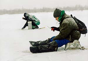 В капризный клев приходится подбирать уловистые варианты. В прошлые зимы срабатывало сочетание "чертика" внизу и расположенной выше легкой однокрючковой обманки с кембриком. Иногда, довольно редко, приходится на леску с безнасадками ставить разноцветные бусинки. Помогает, конечно, но возрастает число багрений рыбы под нижнюю челюсть.