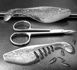 При помощи острых маникюрных ножниц в килевой части виброхвоста делаю несколько клиновидных вырезов. Причем, вся работа выполняется непосредственно на водоеме. Сделав несколько насечек, здесь же, у берега, после нескольких испытательных "купаний", я, по ходу дела, выбираю необходимое количество вырезов и их глубину, добиваясь максимальной частоты колебаний при минимальной скорости проводки. Главное, не переусердствуйте в "резьбе", а то ваш новый виброхвост может при незначительной окуневой хватке лишиться лопасти.