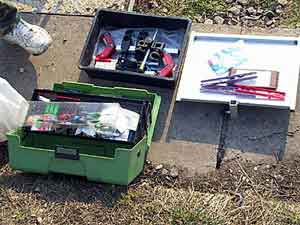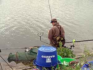 Под ноги положил пару досок - получилась хорошая платформа. Установил все стойки справа от себя, 2 стойки для кита, держатели удилища в рабочем положении, а вместо ловушки поставил деревянную рогульку. Само собой, как положено, разместил садок, стойку для насадки, подсачек (которым ни разу не воспользовался) и слева - тазик с прикормкой. Сделал несколько оснасток на предполагаемую глубину ловли с 1,5-2 г поплавками (на Топ-4) и на всякий случай взял пару оснасток 0,5 г на Топ-3 и 2,5-3 г на Топ-5. Собрал штекер длиной 9,5 м (опять же по советам более опытных товарищей - без последнего колена). После замера глубины (при котором был оторван один из глубиномеров вместе с поводком) возникла дилемма - глубина оказалась всего 2,5 м вместо ожидаемой 3,5-4. Место менять не хотелось, поскольку в пределах видимости лучше ничего не было. В итоге я поставил оснастку 0,5 г, с поплавком DAM Round, длиной 3,3 м. (Была еще 2,65 м, но мне показалась - маловато 15 см до поплавка. Забегая вперед, скажу, что вопреки предсказаниям гуру, эту оснастку я запутал всего пару раз и то не смертельно - распутывал за минуту. )