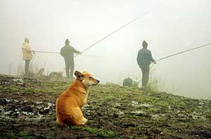 Черная собака появилась чуть позже и заняла место на возвышении, с которого просматривался берег и на котором обычно останавливались вновь прибывшие рыболовы, чтобы оглядеться и решить, в каком месте сегодня, так сказать, разматывать удочки. На берегу были сложены вещи пришедших незадолго до нее трёх московских рыболовов. Их нетрудно отличить от местных по экипировке, покупным чехлам для удочек и коробкам со всякой всячиной. Коробочки обычно напоминают своим разнообразием прилавок небольшого магазинчика, а содержанием говорят о том, что профи, "лечащие" нашего брата со страниц журналов и газет, отрабатывая свой хлеб на службе фирм-производителей рыболовных снастей, не едят его зря. Но не это заинтересовало собаку, отвисшие соски которой красноречиво говорили о том, что ей есть о ком заботиться и ради кого искать себе пропитание. Выбрав момент, когда все стоящие в ряд на берегу рыболовы отвернутся, она быстро сбежала вниз и, ухватив вкусно пахнущий бутербродами пакет, с неожиданной резвостью поволокла его в гору. Благо, кто-то из местных, привычных время от времени приглядывать за своими вещами, обернулся. Приходящие на рыбалку здешние пионеры, особенно летом, того и гляди скоммуниздят коробку с блеснами, а то и весь оставленный без присмотра рюкзак. Был случай, когда один из рыбаков, стоя в воде спиной к берегу, неожиданно услышал, как удаляется звук его включенного на берегу портативного приёмника...