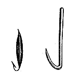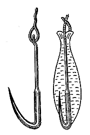 В особенно крепких и толстых лесках нет никакой надобности и совершенно достаточно лески в 6 и никак не более 9 волос или шелковой, потоньше обыкновенной булавки. Только при ловле на жерлицы, на блесну и дорожку, когда вообще больше вероятности, что вместо окуня возьмет щука, необходима более толстая леска, иногда даже бечевка, притом с поводком из тонкого баска. Крючки, одиночные, средней величины (от № 1 до № 4), привязываются или непосредственно к леске, или на поводках из т. н. буйволочного волоса, или же тонкого баска. Двойные, тем более тройные крючки-якорьки употребляются сравнительно редко, но весьма полезно иногда (при хорошем клеве) навязывать на поводок т. н. мотыльный крючок с длинным стержнем, который не может быть глубоко заглотан.