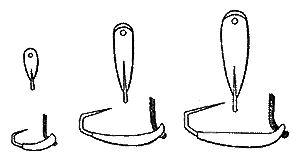Лучшей из оловянных блесен, на основании личного опыта, я признаю сердобскую, имеющую выгиб, а в разрезе форму равнобедренного треугольника с очень тупым углом в вершине и двойным крючком (в хвосте). Московская блесна - трехгранный кусок олова с одним крючком в голове - слишком тяжела и пригодна только для осеннего блесненья, так же как, по всей вероятности, новгородская - плоский овальный кусок олова (а иногда и свинца) с одним крючком. Нижневолжская блесна не может иметь правильного движения под водой. Обские блесенки отличаются от нее небольшой величиной и тем, что на крючок насаживается мормыш или, за неимением его, кусочек губки. Много лучше последних астраханская - очень тонкая оловянная пластинка, формой похожая на чехонь, с выгибом посредине, как у сердобской, и одним крючком (без зазубрины), заложенным в голову.