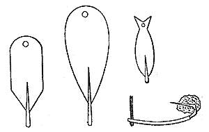 Западносибирские медные блесны имеют различную, иногда довольно странную форму, но все делаются с внутренним выгибом. По моему мнению, самые лучшие блесны из легких зимних - сделанные из чайной ложки (мельхиоровой, польского серебра и пр.) или же переделанные из заграничной блесны-дорожки в форме ложки. Крючок, с зазубриной или без нее, припаивается к узкому концу ложки, изнутри ее. Следует заметить, что медные блесны употребляются реже оловянных и также местами, хотя они по своей легкости для зимней ловли большей частью пригоднее оловянных. Блесна обыкновенно непосредственно привязывается к лесе, но так как при этом способе прикрепления блесна не может очень быстро колебаться, то лучше вставлять в отверстие небольшое медное колечко, края которого спаиваются.