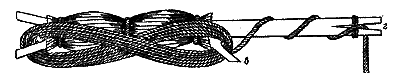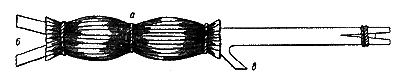 Для блесненья из прорубей удильник делается из гибкого прутика (можжевелового, березового) около метра длиной; комель, чтобы удобнее было держать, обертывается камышом. Всего удобнее для зимнего блесненья западносибирский "мотылек", от которого саратовская зимняя удочка отличается только длиной и тем, что составлена из двух частей. Мотылек - прутик 36 см длиной, с сучком в 1,7 см посредине; оба конца надкалываются ножом, в расколотые места вкладываются маленькие клинышки и стягиваются тонкой бечевкой. Затем на часть прутика а накладывают кругом, в несколько рядов, камыш (куга), натуго перевязывают его в трех местах бечевкой и обравнивают. Леска наматывается на сучок в и надкол б. Саратовская зимняя удочка имеет до аршина длины и употребляется также и для зимнего ужения на червя. Можно, разумеется, блеснить и на кобылки (см. ерш) большого размера, но не иначе как с более длинным и очень грубым кончиком.